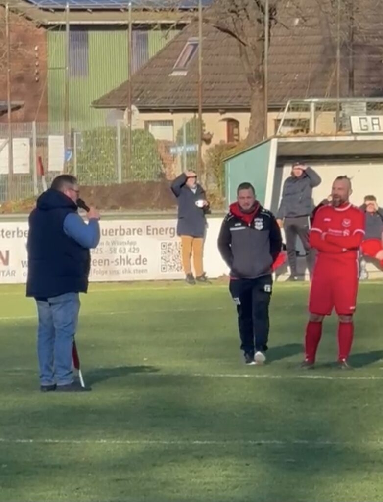 Vor dem Derby gegen den TSV Buchholz III übergab Harry Bei den Verantwortlichen der Gäste die TSV Fahne, die vor einem halben Jahr Schlagzeilen schrieb, als sie im Waldstadion herrenlos aufgefunden wurde.